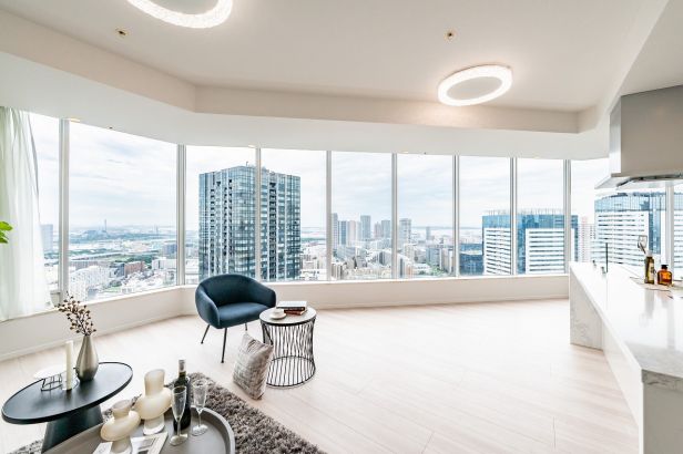 「豊洲」駅徒歩6分。商業施設が徒歩圏内。充実した共用施設。最高2650㎜の天井高とダイレクトパノラマウインドウで開放感溢れる眺望。陽当たり良好な南東角住戸