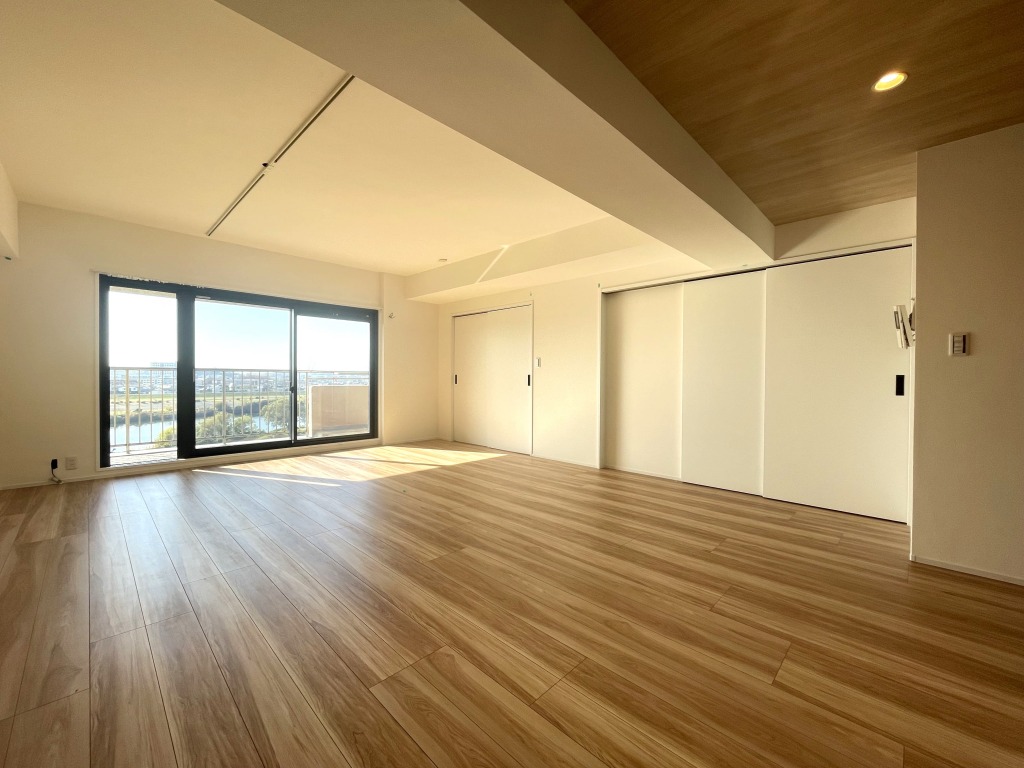 多摩川河川敷まで徒歩2分。多摩川ビューの緑と開放感に包まれる日常。ゆとりの20帖のLDK、12帖の主寝室。2面採光で陽当たり良好な住戸