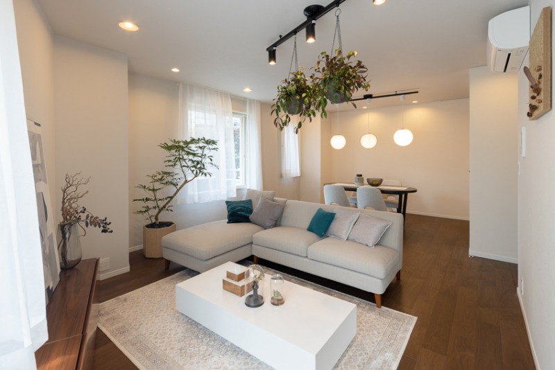 ダークトーンのフローリングと、ホワイトの壁面とのコントラストが美しいリビングダイニングキッチン。2面に設けられた窓から日差しがやさしく注ぐ、心地いい空間が広がっています。