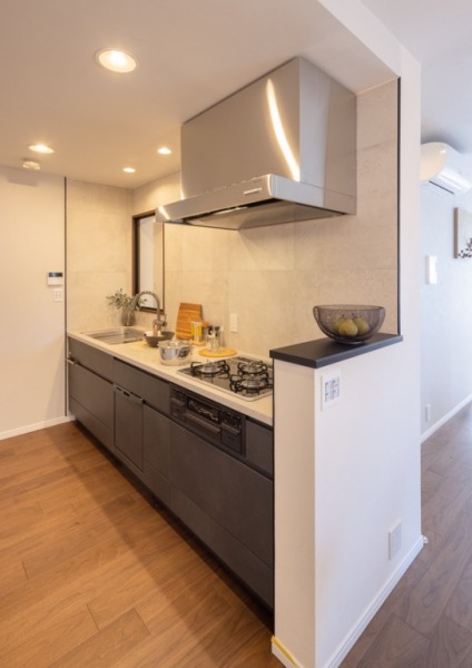 リビングダイニングに併設されたキッチンスペース。ダークトーンのキッチンが洗練された調理空間を演出しています。カウンター越しにリビングダイニングとコミュニケーションを取りやすい設計なのもポイント。