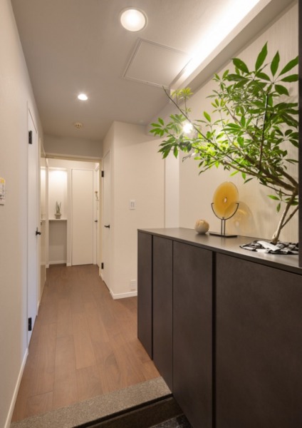フローリングのぬくもりが落ち着きを感じさせる、玄関から廊下へと続くスペース。シックなカラーの下足入れが、空間をぐっと引き締めスタイリッシュに演出しています。