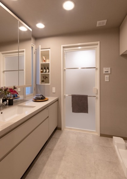 広々とした洗面室は、ワイドな洗面カウンターで忙しい朝の時間にもゆとりをプラス。壁面にも収納を備え、すっきりと片付けやすいのも嬉しいポイントです。