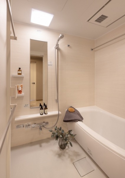 ゆったり浸かれる1418型のバスタブを採用したバスルーム。余計な装飾のないクリーンなインテリアで爽やかな印象に。