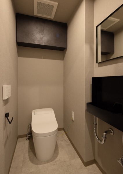 洗練された色使いのトイレ空間。洗面台や収納をブラックで統一し、きりりとしたまるで店舗のような場に。収納にストック品などをしまえるので、常に快適な場をキープできます。