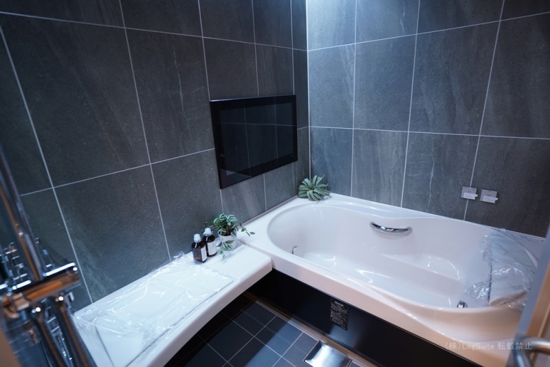 石貼りできりりとした印象をたたえるバスルーム。テレビモニタの設置も可能で、いつものバスタイムがワンランク上のものに。