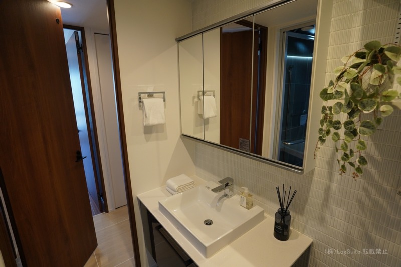 ミニマルで使いやすい洗面室は、ミラーキャビネットを採用し身だしなみチェックもスムーズ。朝の忙しい時間も煩雑さを感じさせません。