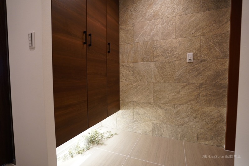 石材をふんだんに採用し、フットライトが情感たっぷりに照らす玄関。木目調の下足入れがアクセントとして空間を引き締めています。