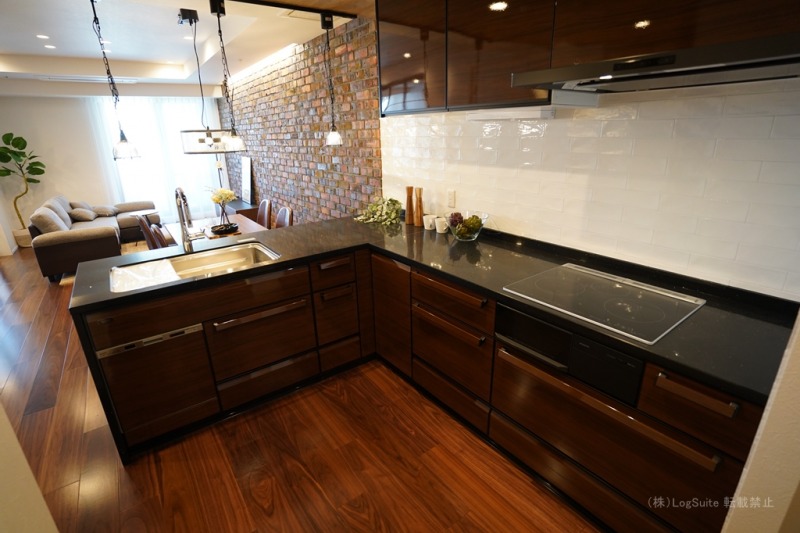 レンガの風合いを取り入れた壁面が印象的なリビングダイニングキッチン。キッチンはL字のワイドなカウンターを使用し、本格的な料理も存分に楽しめます。