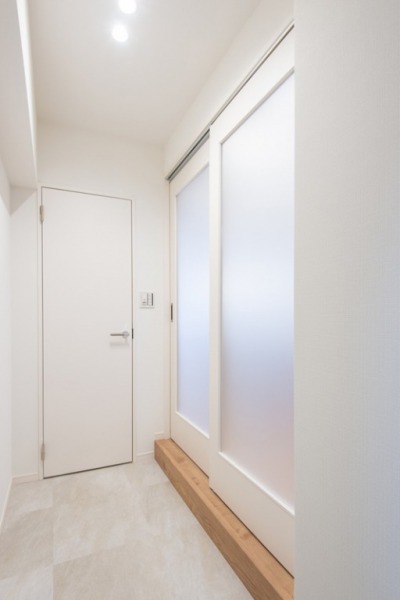 ホワイトを基調とした中にウッドの上り框がアクセントとなった玄関。フロストガラスを大胆に取り入れた扉からの光が、穏やかで快適な生活を予感させます。