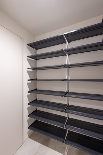 廊下の全面に設けられたクローゼットと玄関横のシューズインクローゼットによる大容量収納。家族の持ち物を整理して収納でき、外出時も煩雑さを感じさせません。