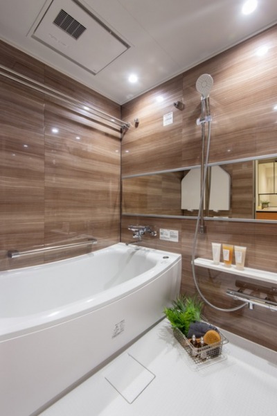 ワイドなミラーと足をゆったり伸ばせるバスタブを備えた、癒しのバスルーム。木目調の壁面がやさしい雰囲気をプラスしています。