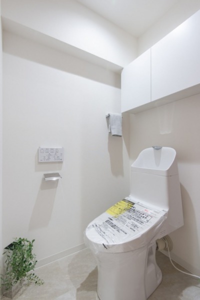 ホワイトを基調としたクリーンな印象のトイレ空間。天袋が設けられており、ストック品などを見せずにすっきり収納可能です。
