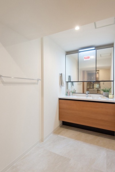 シンプルですっきりとした印象の洗面室。広々とした動きやすい空間で、洗濯などの家事の煩雑さを低減してくれます。洗面台は大判のミラーで朝の支度もスムーズに。
