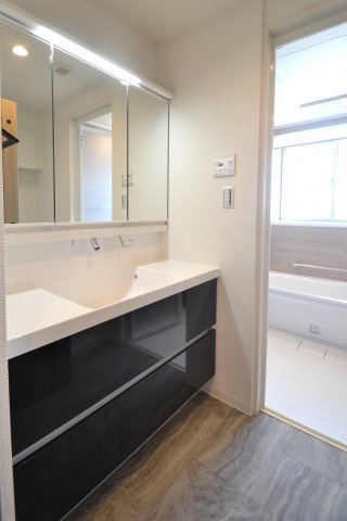 三面鏡にハンドシャワー付き、使いやすい洗面台です。