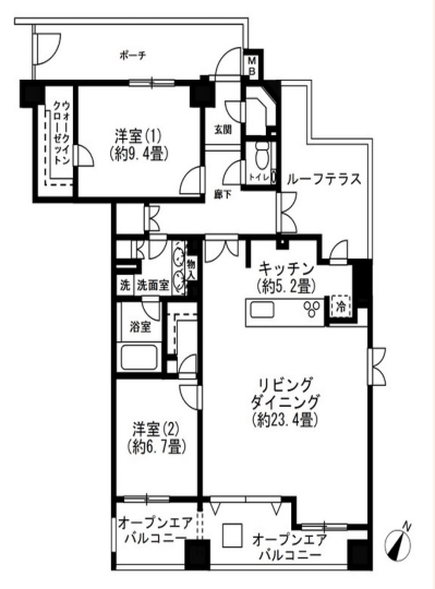 2駅2路線利用可。広々リビングにルーフテラス付き。住み環境良好の2LDK角部屋