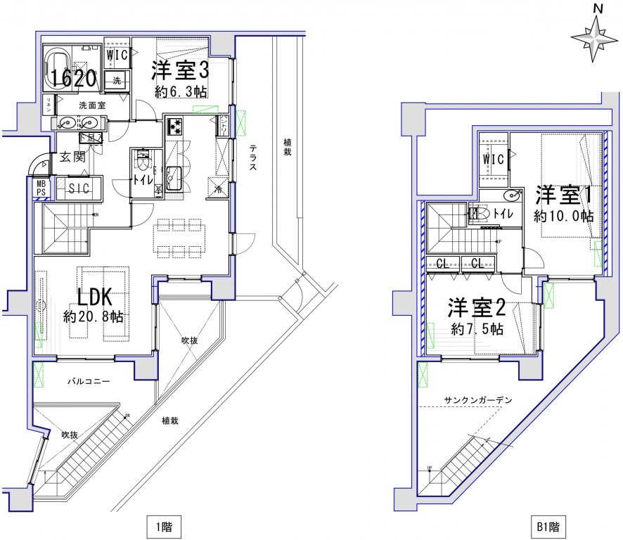 世田谷砧のバス便・買い物に優れた住環境。専有面積111㎡。20帖超の広々リビング、テラスとサンクンガーデン付き南東・角部屋のメゾネット住戸