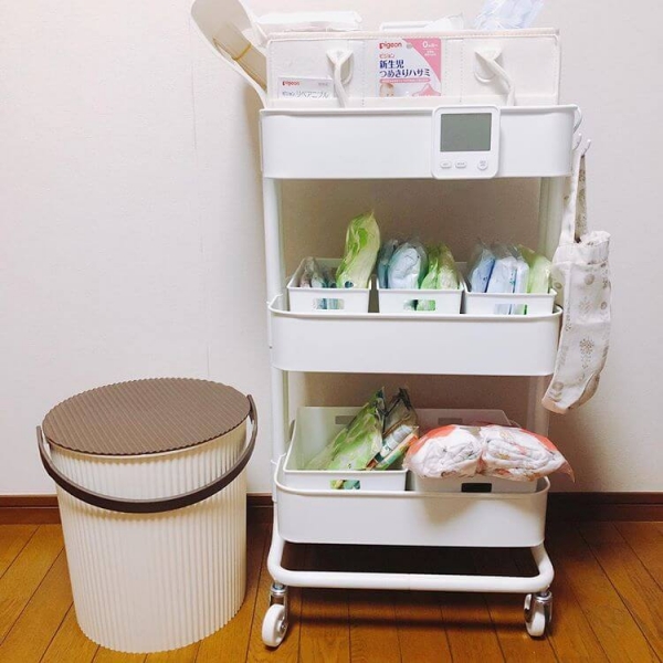 オムツやおしりふきを収納するなら、「ワゴン」を使うことがおすすめです。キャスターが付いているワゴンなら移動が簡単なので、部屋のどこででも赤ちゃんのお世話がしやすくなります。