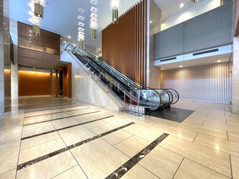 【エントランス】2層吹き抜けで、ホテルのような高級感溢れる格調高き空間が広がります。エスカレーターで2階に上がると、レセプションがあります。