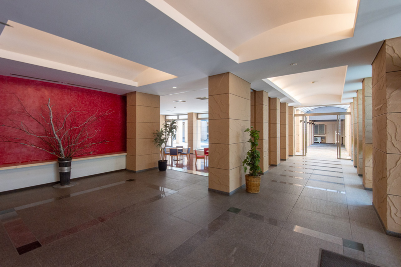 ビビットなカラーリングを目を引くロビー。敷地を贅沢につかった共用部がゆとりを感じさせます。