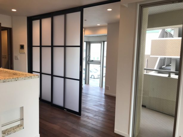 ウォールナットの素材にこだわった回遊性のある空間。間取りを3LDKから2LDKへ変更し、採光を取り込む間仕切りドアを採用するなど、使い勝手にも工夫を凝らした福岡市の中古マンションのリノベーション事例をご紹介します。